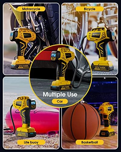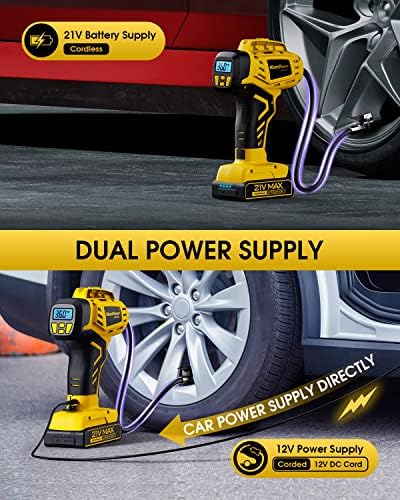 Dual Power Supply Modes: When tire inflator in Cordless mode, power up with the 21V rechargeable battery. When Corded mode is needed, simply plug in the 12V DC car charger at the back of the tire inflator. It’s a reliable emergency inflation solution when battery is low on the go. Say goodbye to the frustration of dead batteries and hello to uninterrupted adventures!