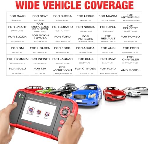 [Extensive Vehicle Coverage + 9 Languages]–The LAUNCH CRP123 reads data from ENGINE, TRANSMISSION, ABS and SRS systems from Asian, US and European manufacturers. Coverage includes Suzuki, Honda, Mitsubishi, Nissan, Toyota, Mazda, Hyundai, Kia, Subaru, Infiniti, Lexus, Acura, Isuzu, Ford, GM, Chrysler, Benz, BMW, VW, Opel, Volvo, Fiat, Land Rover, Seat, Skoda, Audi, Porsche, Saab, Jaguar and many others. Support 9 different languages.