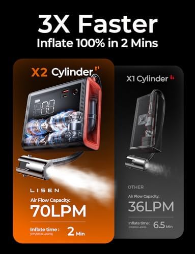 【Portable Air Pump with Double Cylinders Feature】The powerful tire inflator has built-in two high-performance 22mm metal air cylinders that are resistant to high temperatures and pressures, that can quickly inflate tires. It provides a maximum pressure of 150 PSI and an air flow of 70 L/Min, which fills a pickups tire up (0-40PSI) in 3 minutes