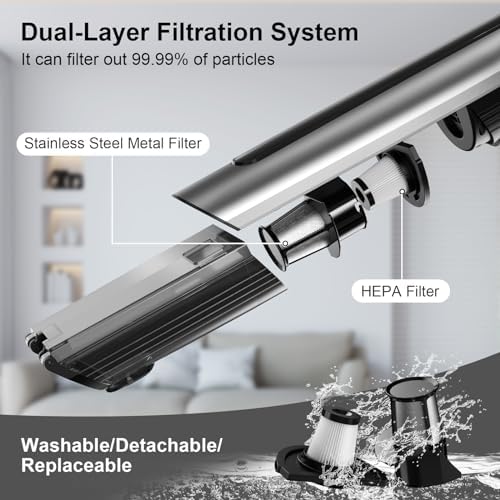 Dual-Layer Filtration System: this small vacuum cleaner is equipped with a dual-layer filtration system comprising HEPA filters and stainless steel filters, surpassing the filtration efficiency of conventional single-layer filters. It can effectively capture 99.99% of dust and tiny particles. The stainless steel filter safeguards the motor from harm, prolonging the portable vacuum for car’s operational life. The filters are washable and easy to disassemble and clean.