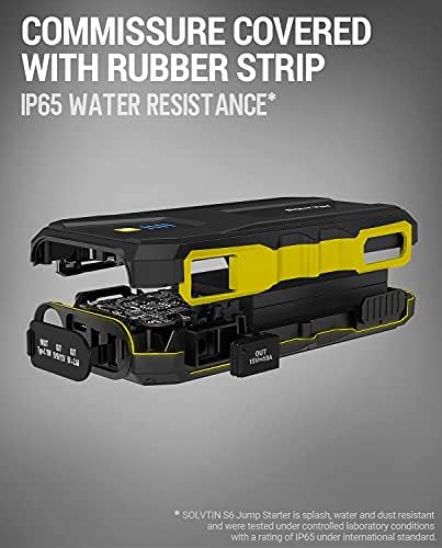 Intelligent Secure Protection: The jumper cables, coming with the SOLVTIN S6 portable jump pack, has a smart protector with 8 protection systems. The red/green indicator ensures the safety during jumping. Heavy-duty jumper clamps are durable enough for repetitive use.