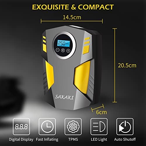 🚗【AUTO SHUT OFF】SAKAKI air compressor portable provides you with rest-assured using experience based on the auto-shut off function. Preset the desired pressure level and start inflating job. When our auto tire inflator reaches the desired pressure, the car air compressor turns off automatically, so you don’t need to worry about over inflating.