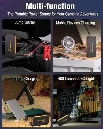 【Portable Laptop Charger with 100W AC Socket】VTOMAN V12 jump starter is also a portable laptop power bank with a 100W AC Outlet which powers your laptop and other small appliances. And another USB-A QC3.0 and USB-A(5V/2.1A) output ports will fully charge your cellphones and other mobile devices at the 3 times speed faster than others. The 15V/10A DC port that can power for other car products as tire inflators, vacuum, etc. The PD 18W Type-C fast Input port will make your trip full of power!